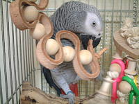 止まり木の左右に新しいおもちゃ・・・さぁ、どっちから遊ぶのかな〜?