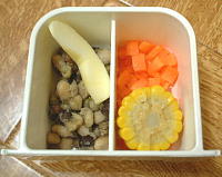 宝助はまず先にリンゴ、そしてとうもろこし、炊き豆、最後ににんじん。(にんじんはほとんど残す)